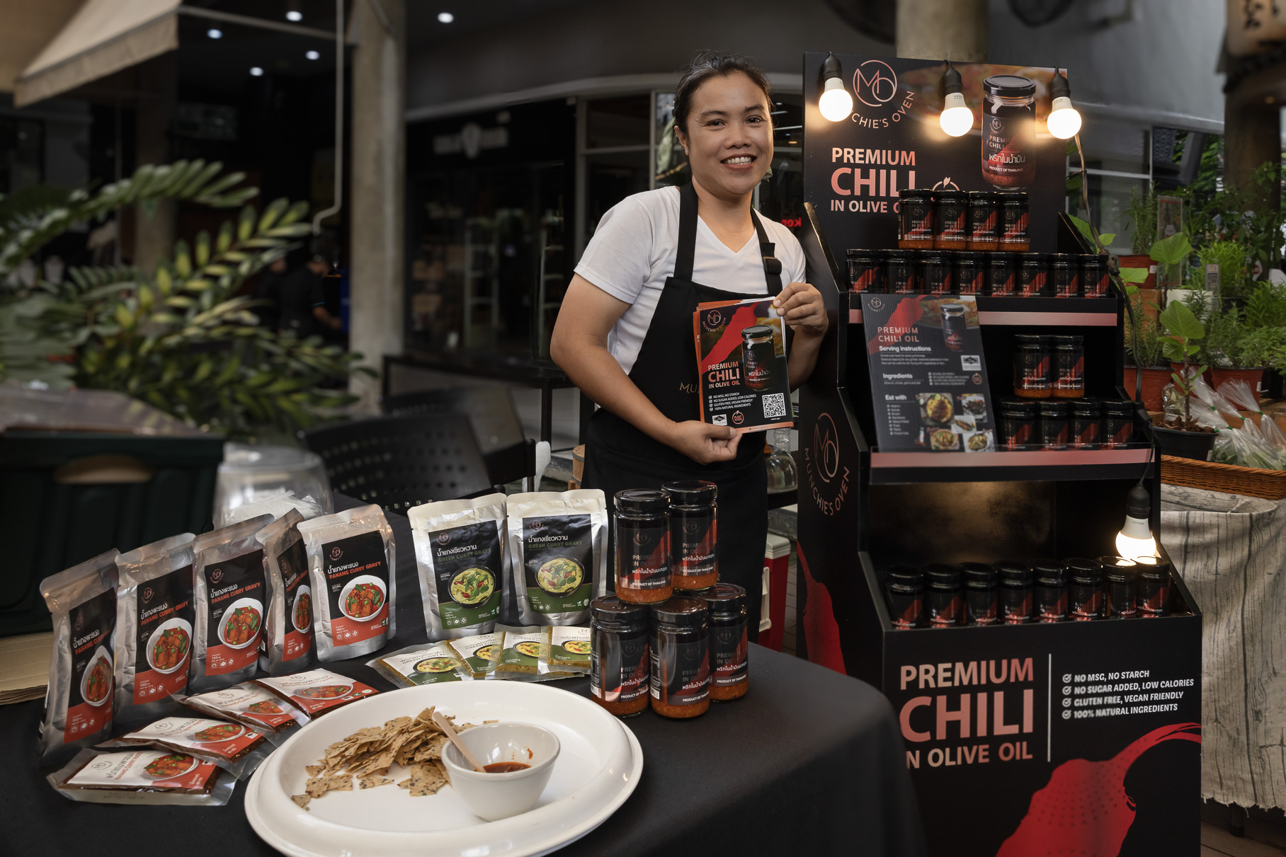- Munchie’s Oven สินค้าขึ้นชื่อของทางร้านคือนำ้มันพริกรสจัดจ้าน ทำจากพริกพริกในน้ำมันมะกอก ใช้เป็นเครื่องปรุงหรือกินกับข้าวเกรียบหรือแป้งนาโชก็แสนจะเข้ากัน