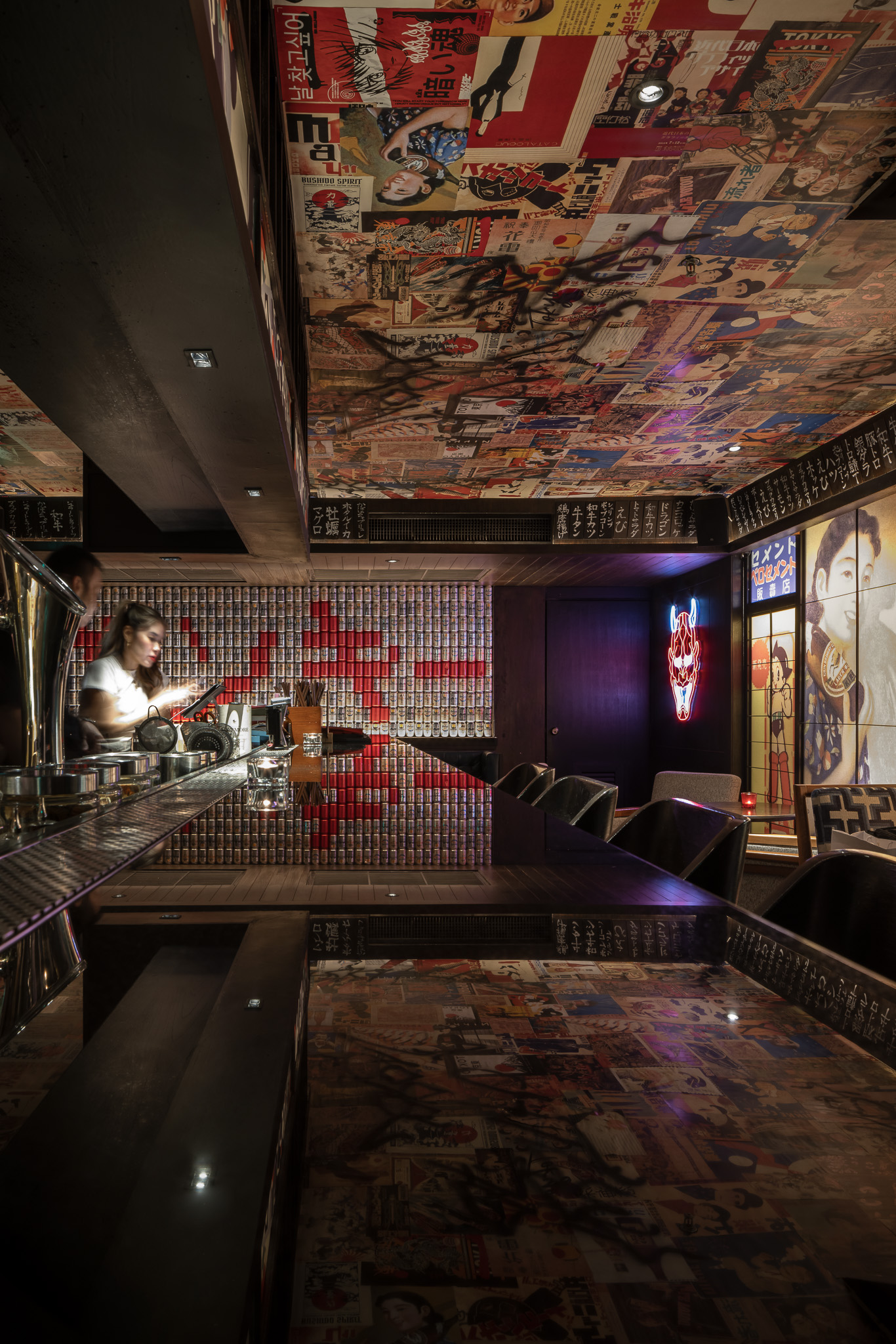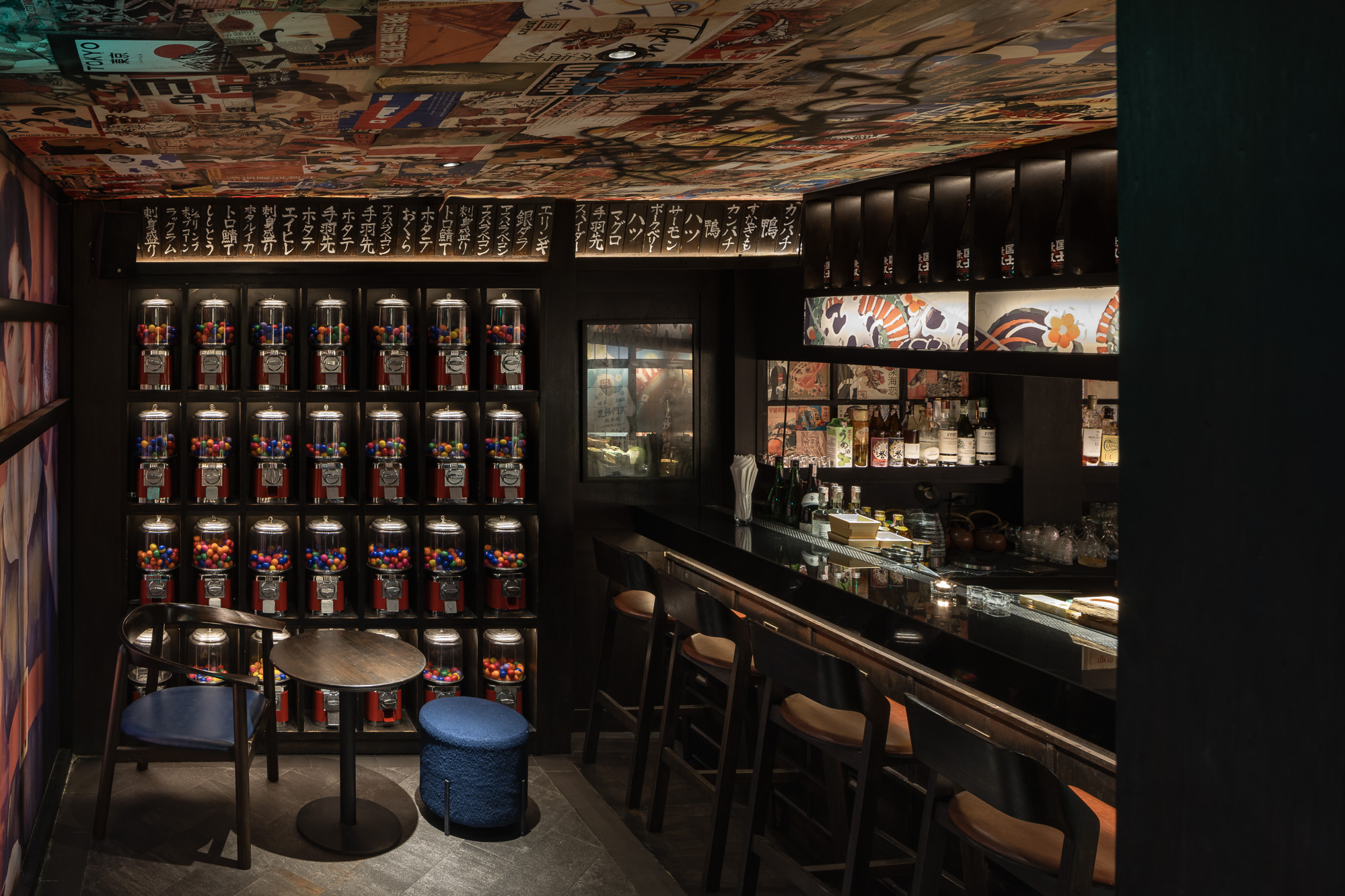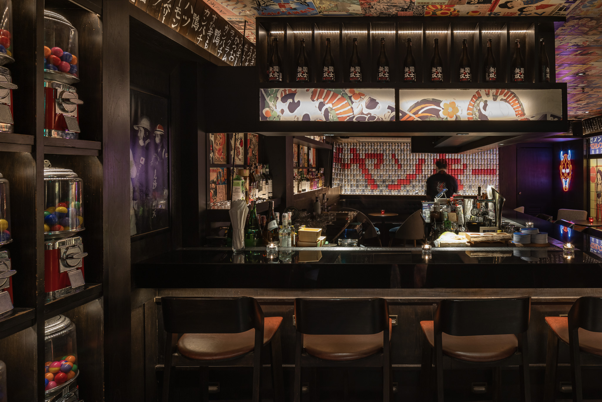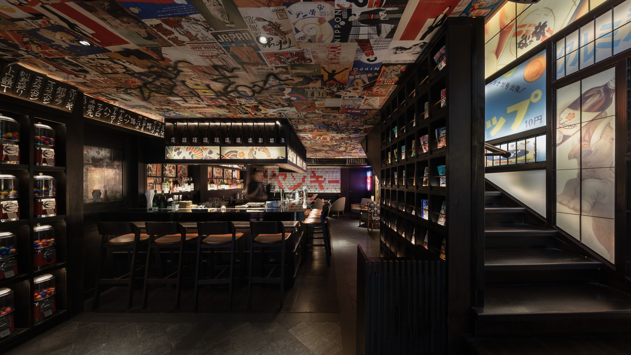 The bar and karaoke area feature dark wood accents contrasted with colorful graphic translucent walls and a ceiling adorned with vibrant posters inspired by 1950s Japanese Dagashi (snack shops). The restaurant’s concept blends the ideas of Legacy and Rebellion.