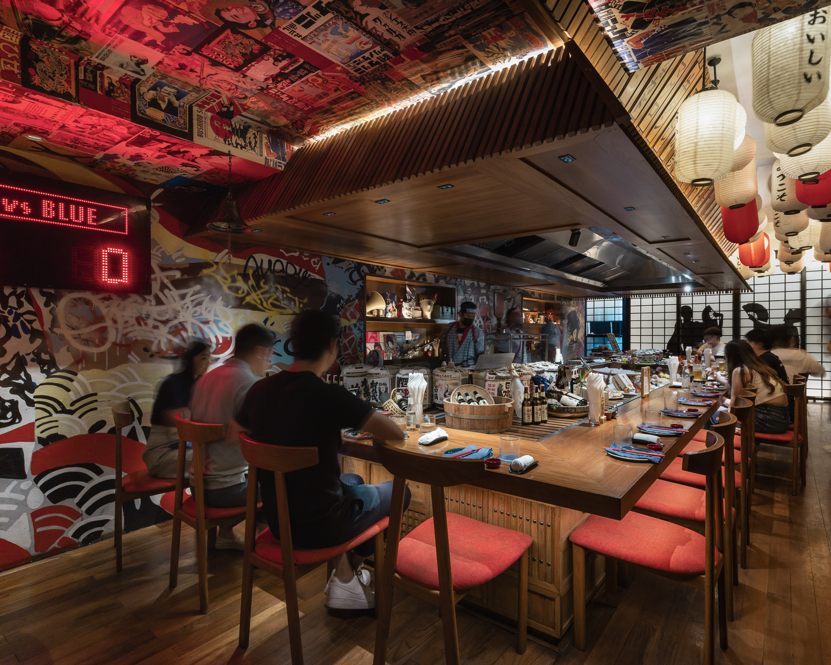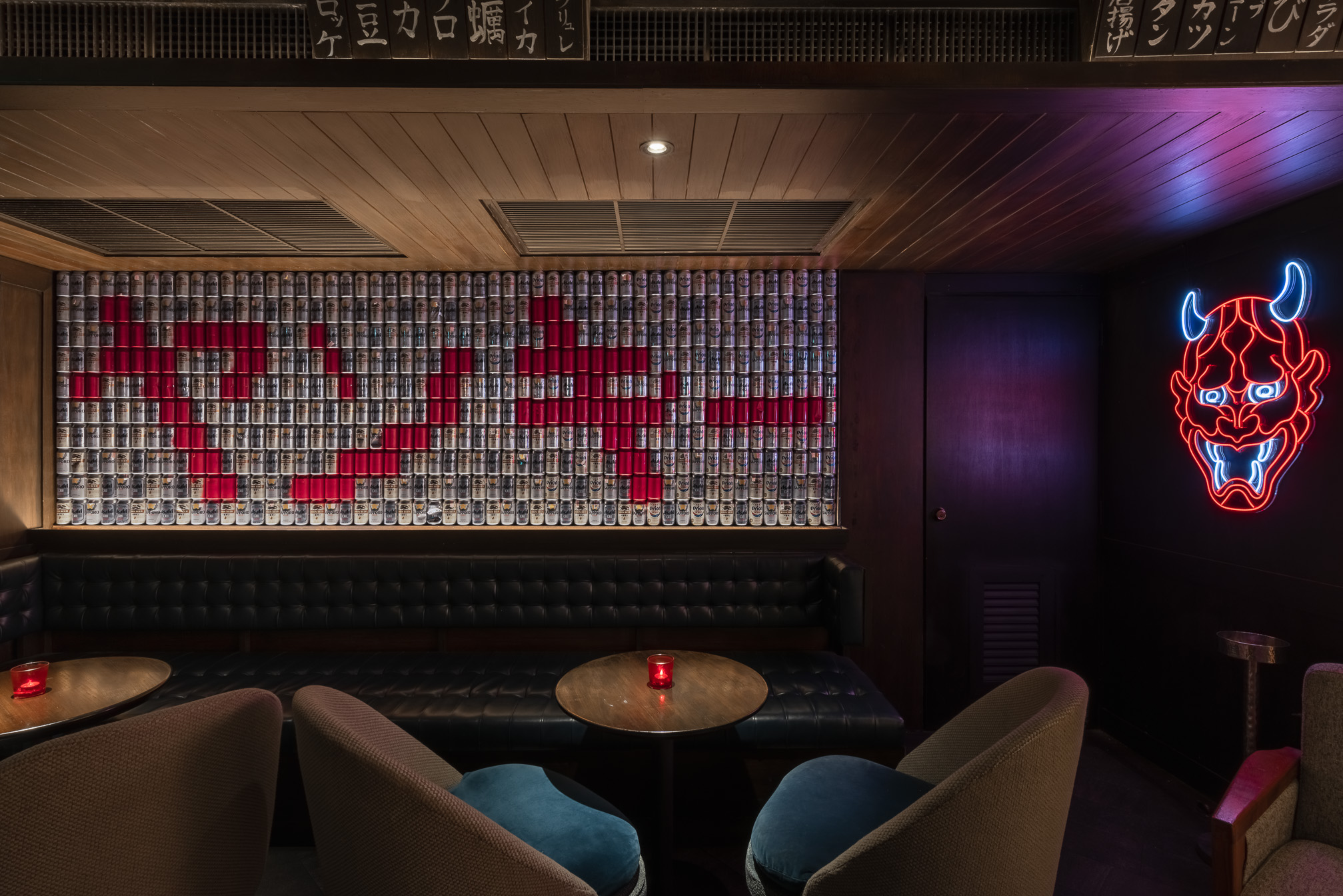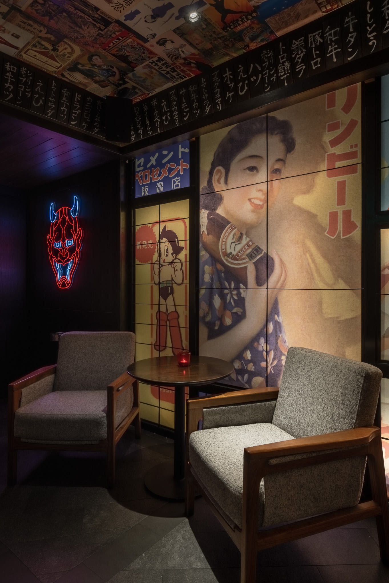 The bar and karaoke area feature dark wood accents contrasted with colorful graphic translucent walls and a ceiling adorned with vibrant posters inspired by 1950s Japanese Dagashi (snack shops). The restaurant’s concept blends the ideas of Legacy and Rebellion.