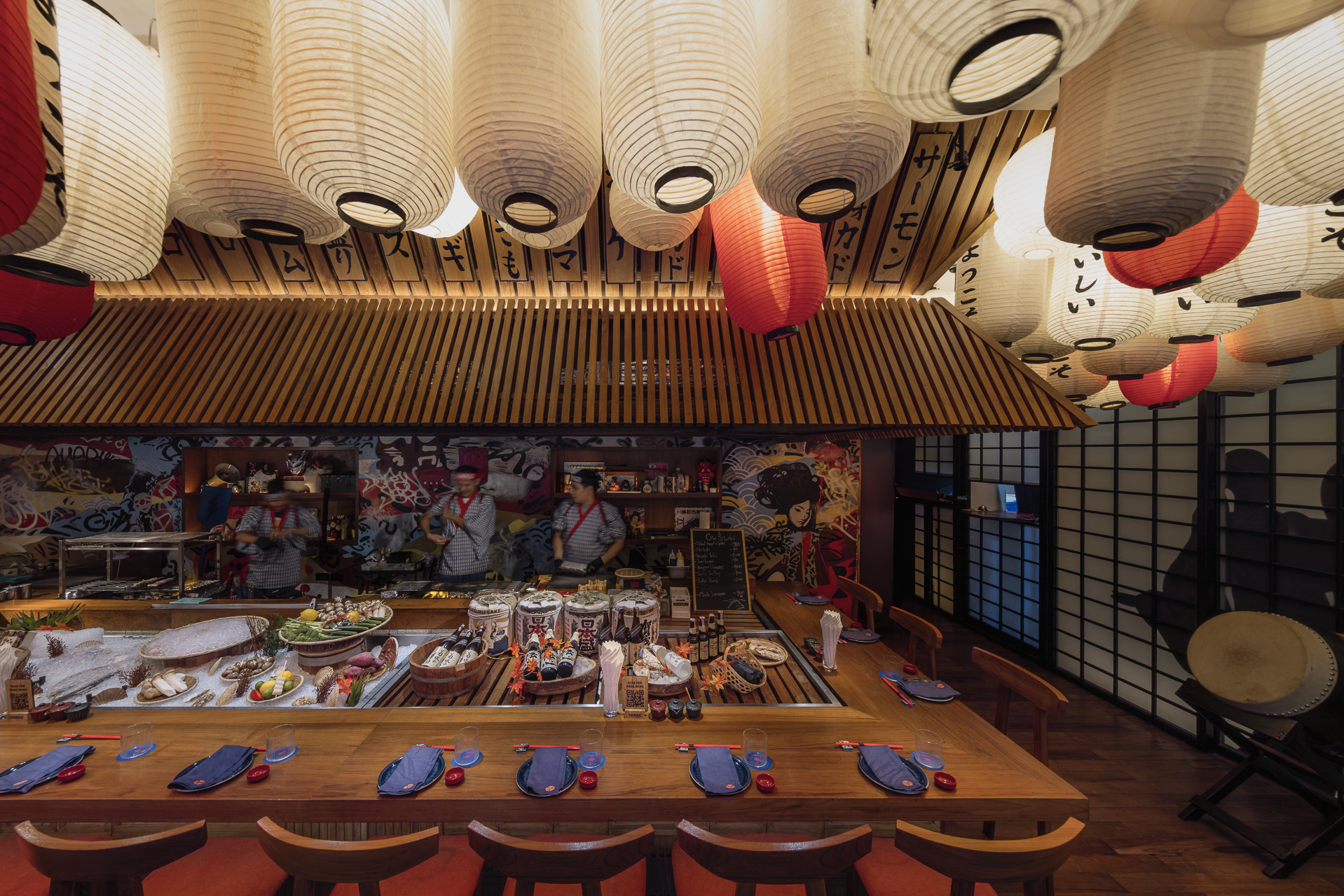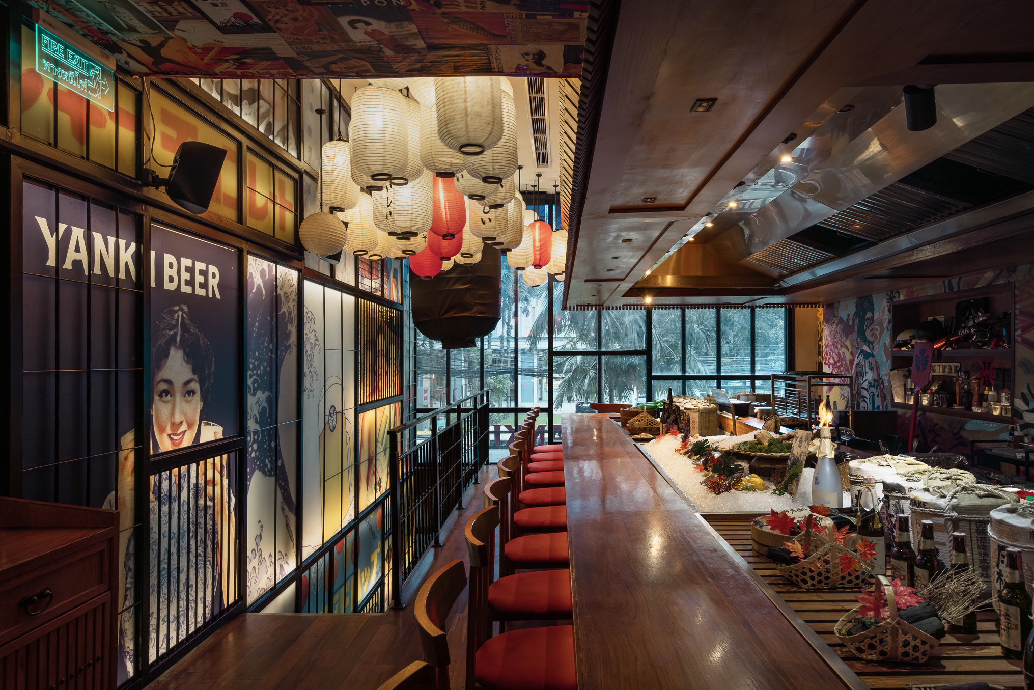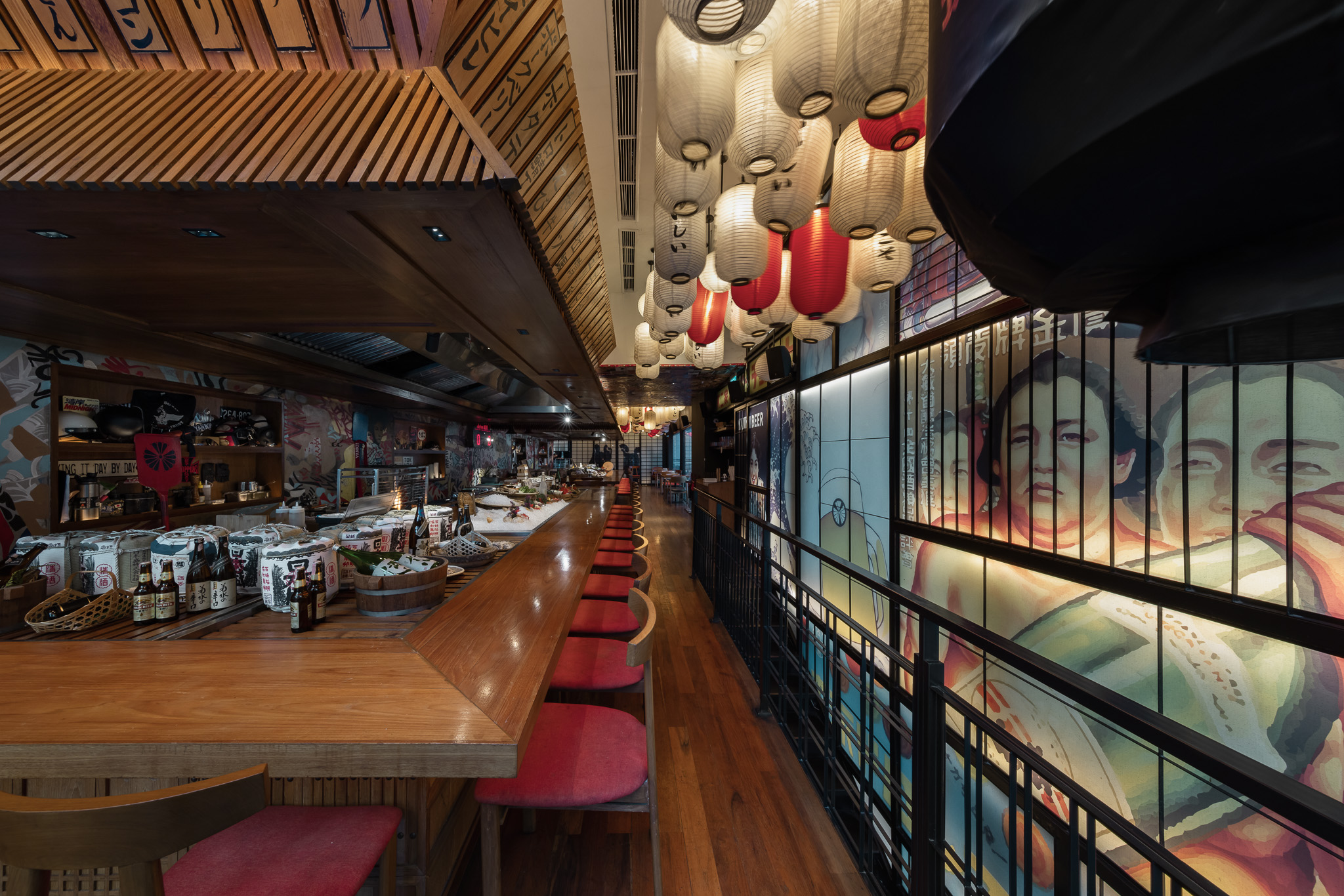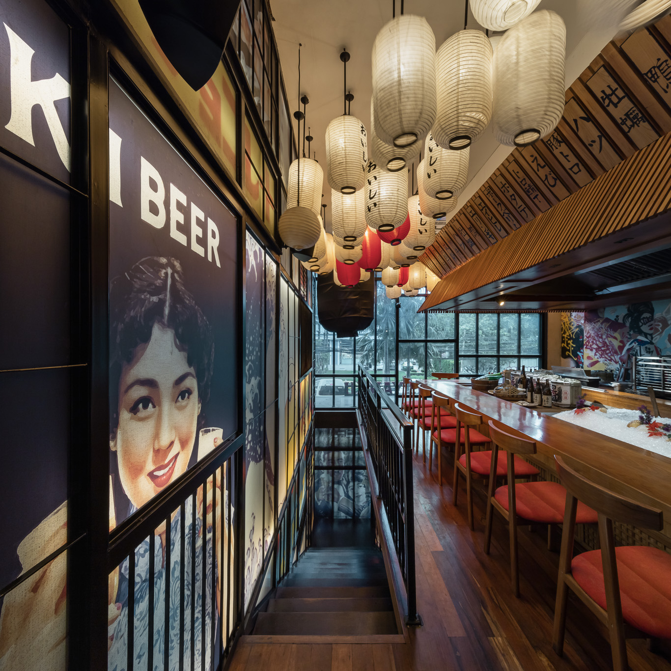 The bar and karaoke area feature dark wood accents contrasted with colorful graphic translucent walls and a ceiling adorned with vibrant posters inspired by 1950s Japanese Dagashi (snack shops). The restaurant’s concept blends the ideas of Legacy and Rebellion.