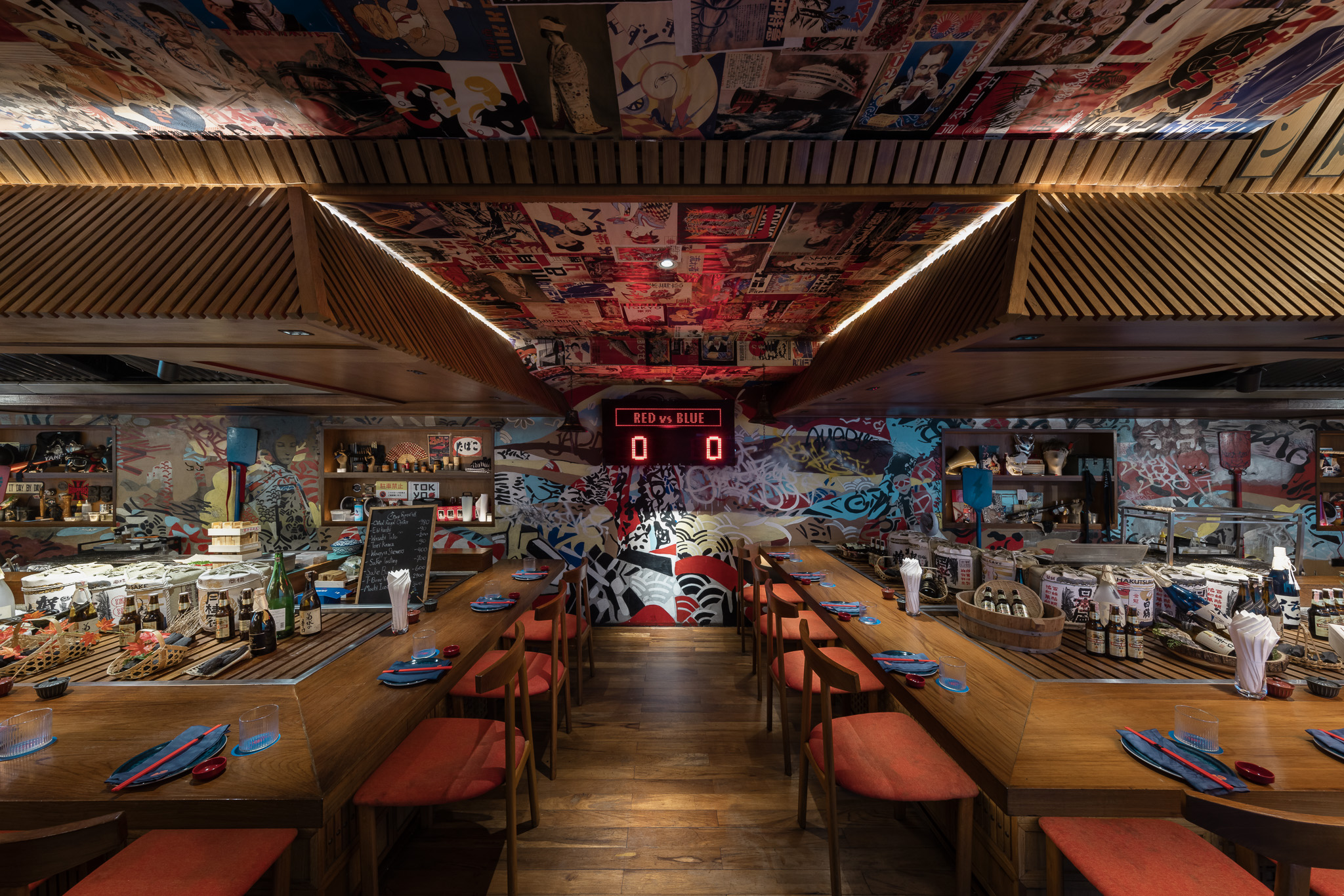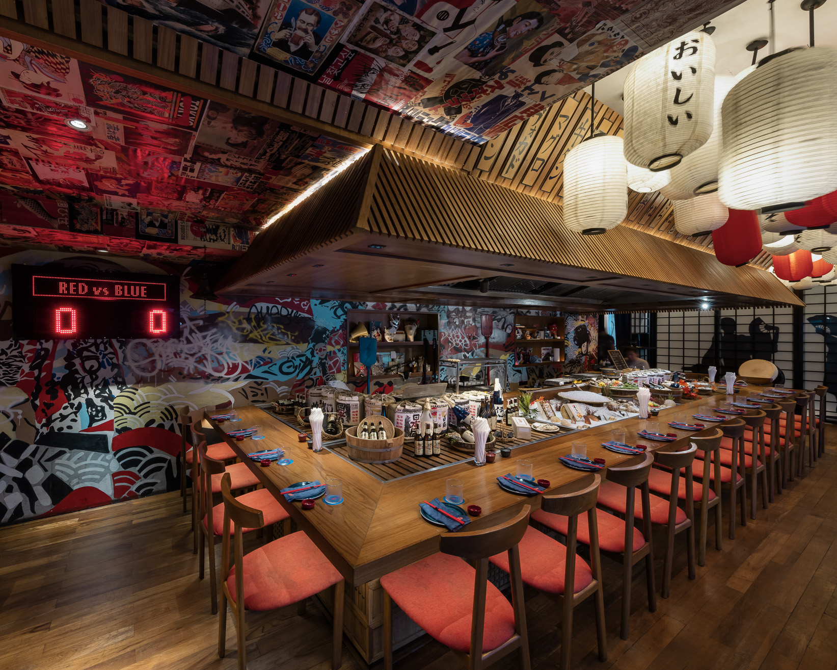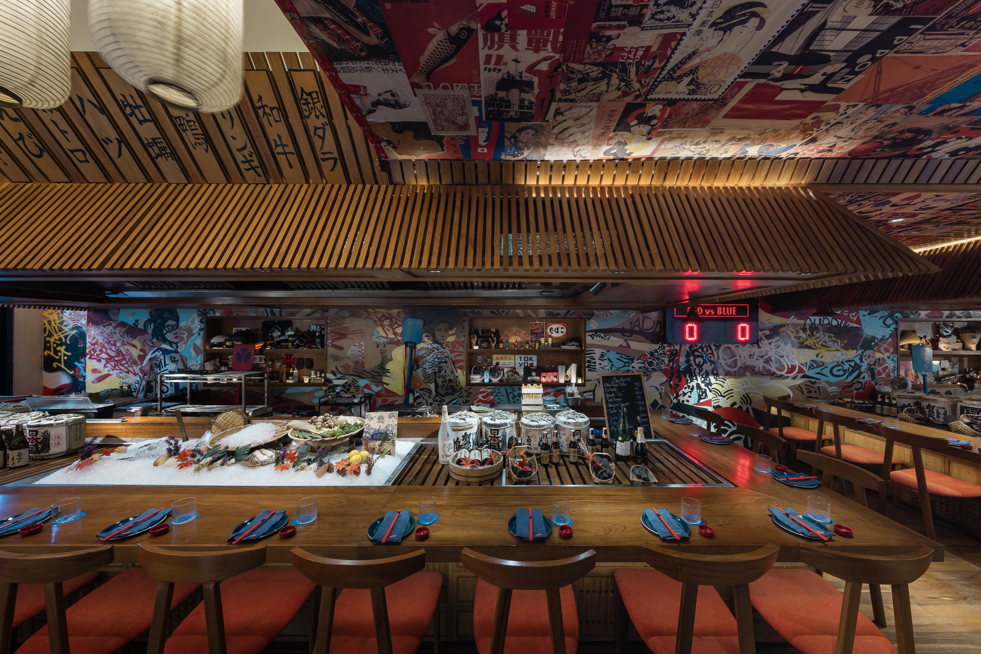 Ascending the stairs to the second floor, guests will find a bar lined with fresh ingredients waiting for the skilled chefs to transform them into culinary delights. The seating arrangement consists of a bar counter divided into red and blue sides, complete with a scorecard indicating the number of drinks consumed by each side throughout the night, a fun gimmick that enhances the social atmosphere.