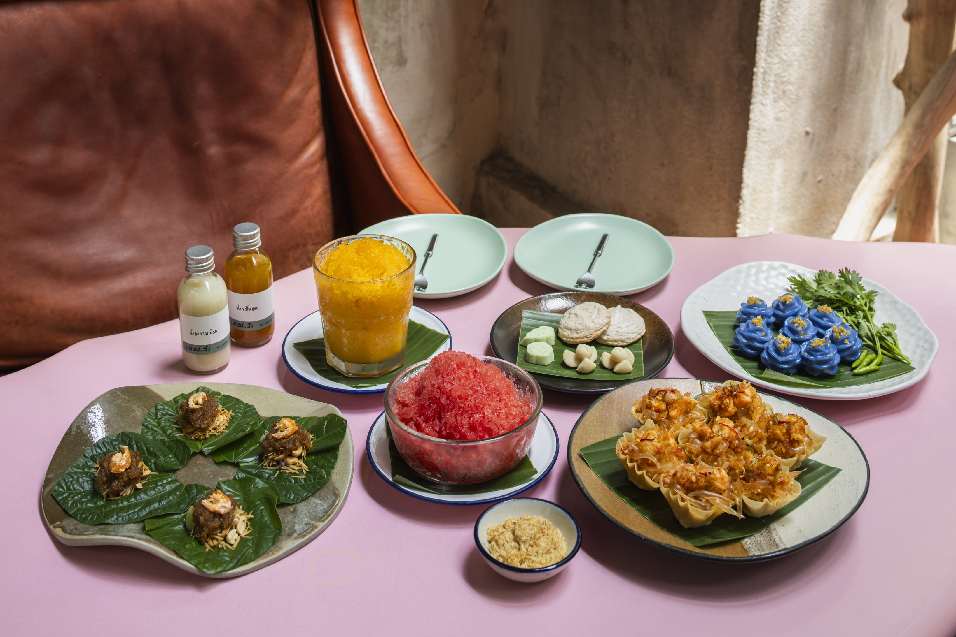 4. Set of Traditional Thai Desserts (Dok Lamduan, Sampanni, Sommanat, and Cha Maiyarab) : Rare, silky, typically enjoyed alongside a herbal drink made from Mimosa (Mimosa pudica), a forgotten wild plant.