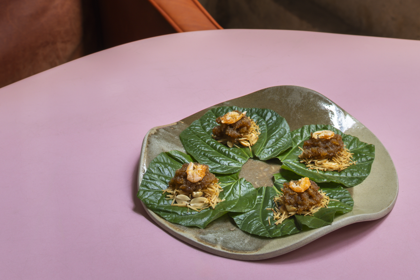 2. Miang Kham : An ancient Thai snack rich in healthy herbs, featuring a sweet, creamy flavor from toasted coconut, a perfectly balanced sauce, and a wonderful aromatic notes from wild betel leaves.