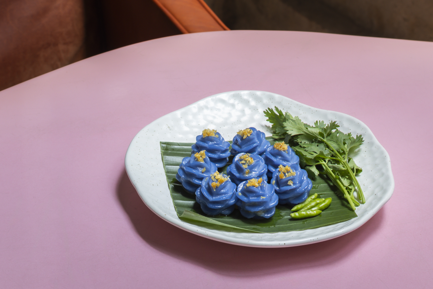 3. Chor Muang : Royal Thai dumplings filled with savory ground meat and a blend of aromatic herbs (coriander root, garlic, pepper), each piece sculpted into a delicate purple flower.